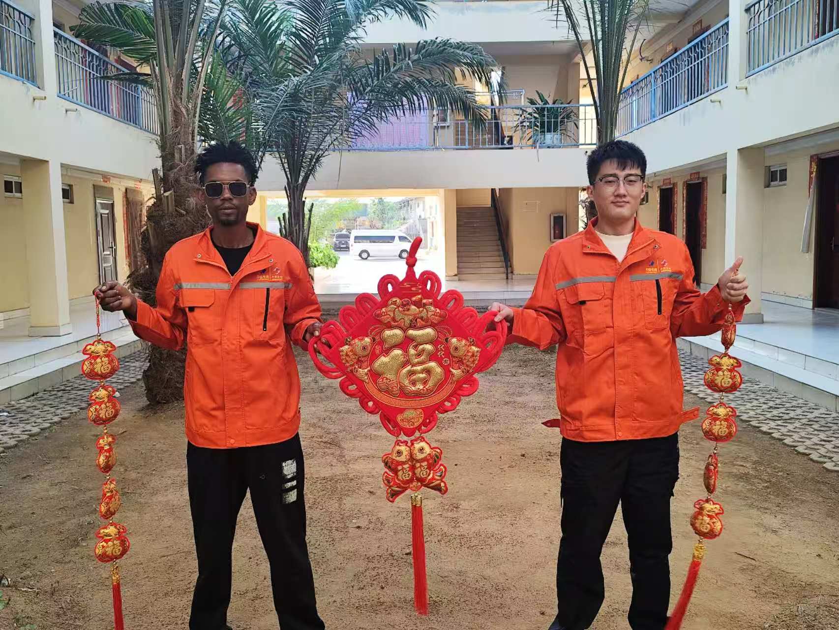 安哥拉分公司營區(qū)一片熱鬧場景,屬地員工焦尼拿著剛寫完的福字,踩在凳子上,在走廊的門上比劃著。他歪著頭,努力想把這張紅紙貼正,卻又拿不準中國習俗里的講究。